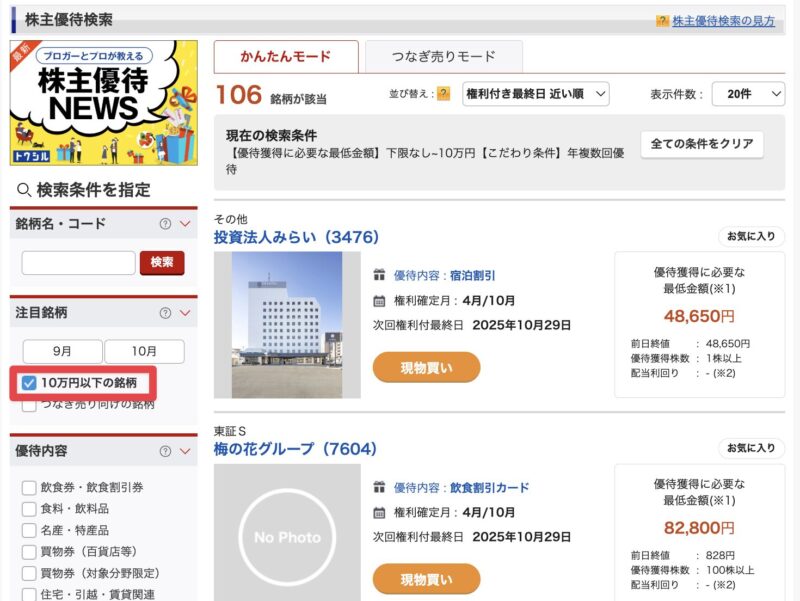 投資初心者にオススメは「10万円以下の銘柄」にチェックを入れる
