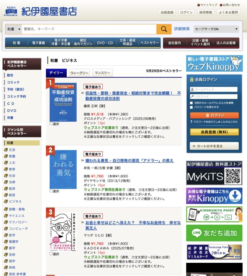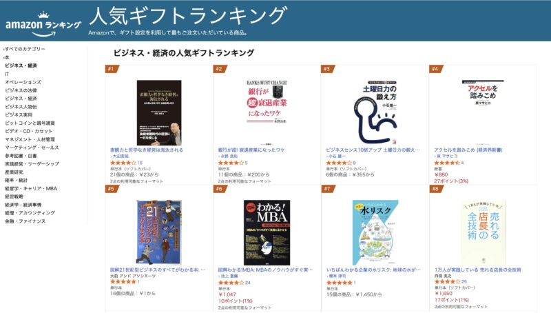 まず、ビジネスの分野で「旬」を逃さないため、紀伊國屋書店のデイリーベストセラーとAmazonのビジネス・経済の人気ギフト・売れ筋ランキングをチェックします。特に「ギフト」ランキングは、人に薦める価値のある本の指標として重要です。