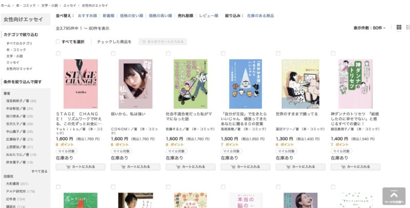 次に、女性視点や共感を重視するため、セブンネットショッピングの女性エッセイの売れ筋とPASSAGEの新着レビューをチェックし、「私に響く一本」を探します。