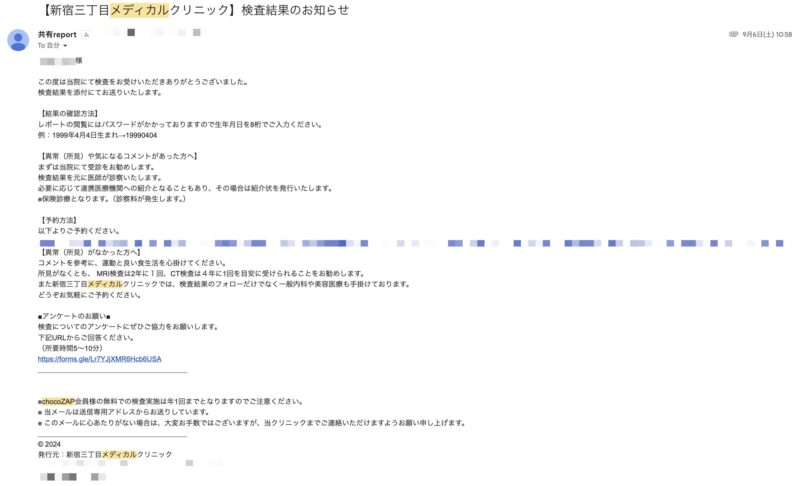 受診から16日後に届いたchocoZAPメディカルからの検査結果メール
