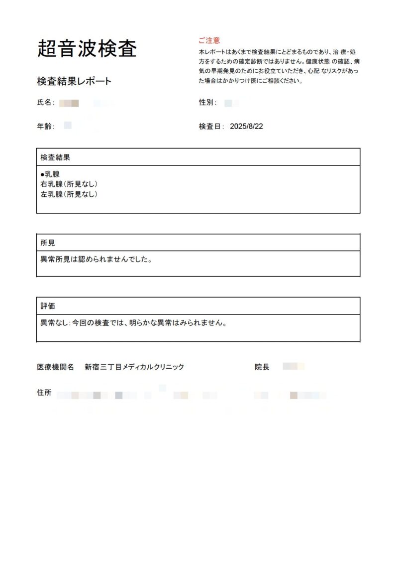 検査の約16日後、chocoZAPメディカルからメールが届きました。添付ファイルには、乳腺エコーの画像と結果がまとめられており、内容を確認できます。結果は「異常なし」でした。この機会のおかげで、自分の状態を客観的に把握できたことに安心し、この結果を見て「今の生活を維持しよう」と意識が変わりました。